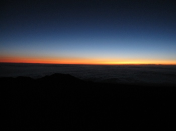 谷底の タロ芋畑や、野生植物を薬代わりに使用している実態の説明を受け、自然の偉大さに感銘を受ける。 夜は今回の旅行の最大の楽しみだった、標高4205mのマウナ・ケア山頂でのサンライズツアーに参加。日の出の時間に合わせる為、深夜(早朝)3時に出発。途中、